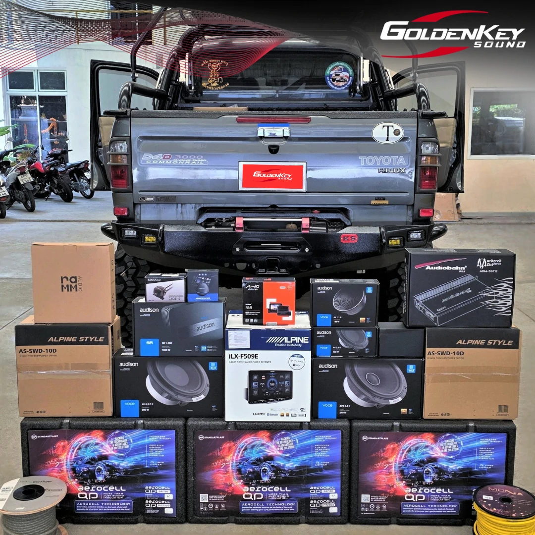 Toyota Hilux ติดตั้งชุดใหญ่ 🚘 อัพเกรดระบบเสียงคุณภาพสูง Alpine-Audison โดยลูกค้าเลือกเป็นรุ่นใหญ่ทั้งหมด งานติดตั้งเน้นความละเอียดปราณีตทุกจุด ใช้เวลาติดตั้ง 3 อาทิตย์ ในส่วนของลำโพงมีการขึ้นชิ้นงานใหม่ทั้งหมด, Power Amp ซ่อนใต้เบาะ, 🔊Subwoofer 10” ติดตั้งในตู้สูตรสำหรับรถรุ่นนี้โดยเฉพาะ ให้เบสหนักแน่น-นุ่มลึก เสริมด้วยติดตั้งแผ่นเก็บเสียงทั้งคันของ Stp Aerocell จากประเทศ Russia 🇷🇺 แท้ 100% ซึ่งเป็นรุ่นใหม่ล่าสุด เก็บเสียงได้ดีที่สุด เพื่อช่วยลดเสียงรบกวนจากภายนอก และเสริมอุปกรณ์พิเศษ กล้องบันทึกหน้า Mio รุ่นท็อป กับกล้องมองหลัง ขอขอบคุณ🙏 K.ลูกค้าประจำมากๆครับ ที่ไว้วางใจทางร้าน Goldenkey Sound ครับ
