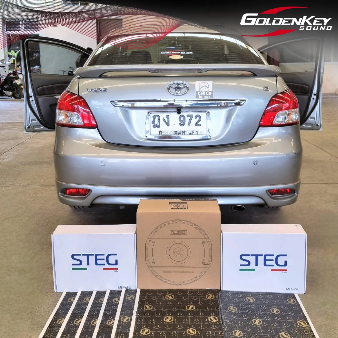 Toyota Vios ติดตั้งชุดอัพเกรดลำโพง พร้อม Subwoofer ในหลุมยางอะไหล่ ไม่เกะกะ-เหลือพื้นที่ใช้สอย ให้เบสที่หนักแน่นนุ่มนวล และติดตั้งแผ่นเก็บเสียงทั้ง 4 ประตู ช่วยลดเสียงรบกวนจากภายนอกเข้าห้องโดยสาร